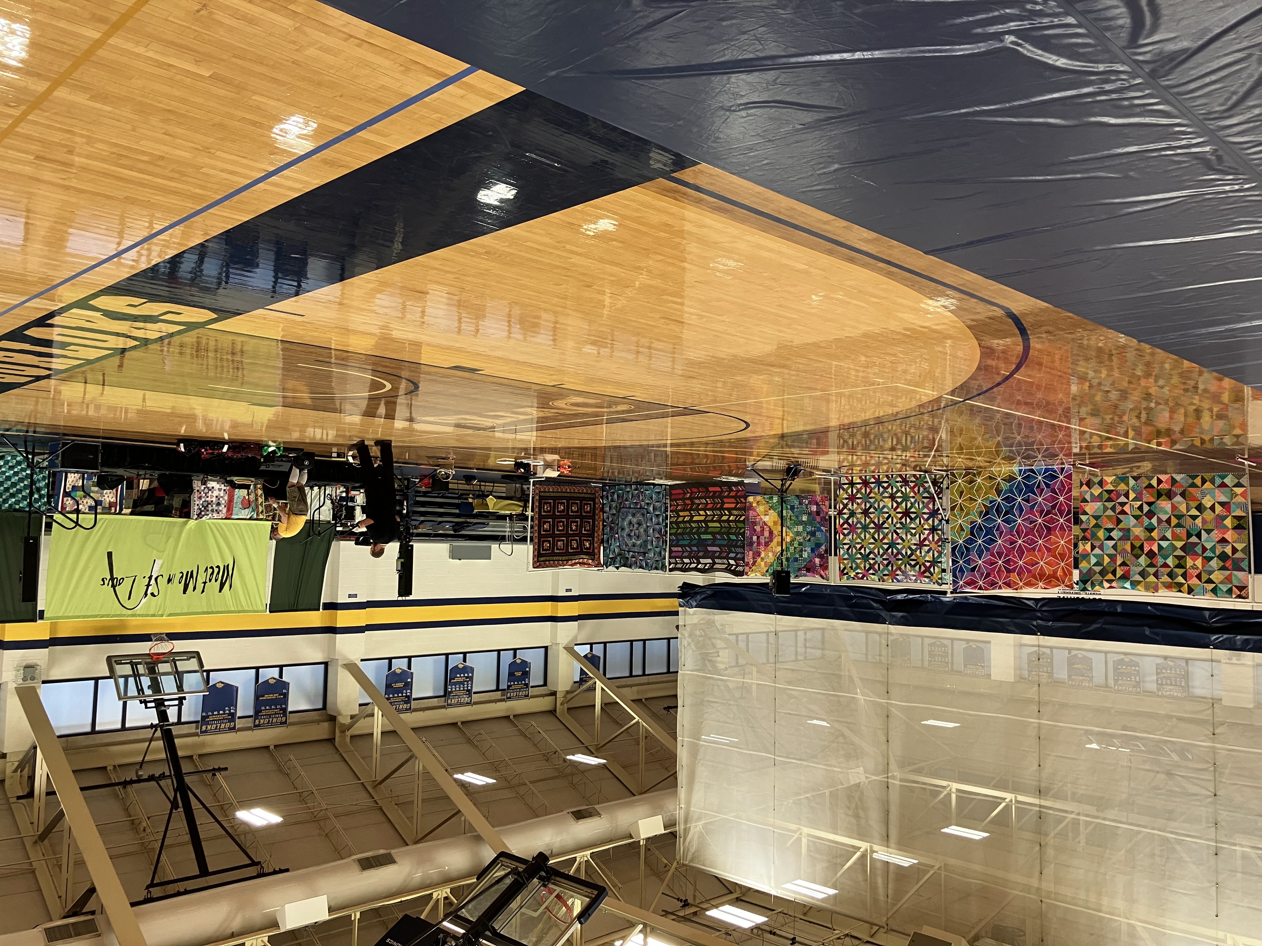 exceedingly drab and dreary Middlebury Municipal Gymnasium with quilts.